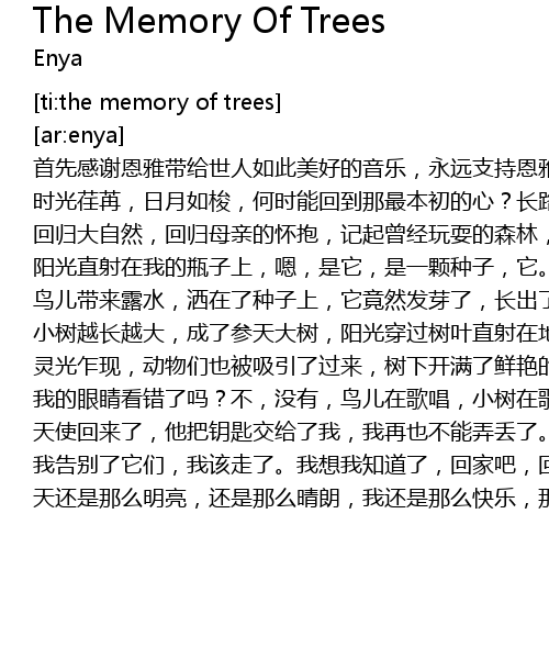 | [02:25.558] | wǒ de yǎn jīng kàn cuò le ma? bù, méi yǒu, niǎo ér zài gē chàng, xiǎo shù zài gē shēng zhōng cháng dà, tā chéng le cān tiān dà shù, páng biān de xiǎo lù yī wēi zài dà shù páng, tā hěn yī liàn a. |