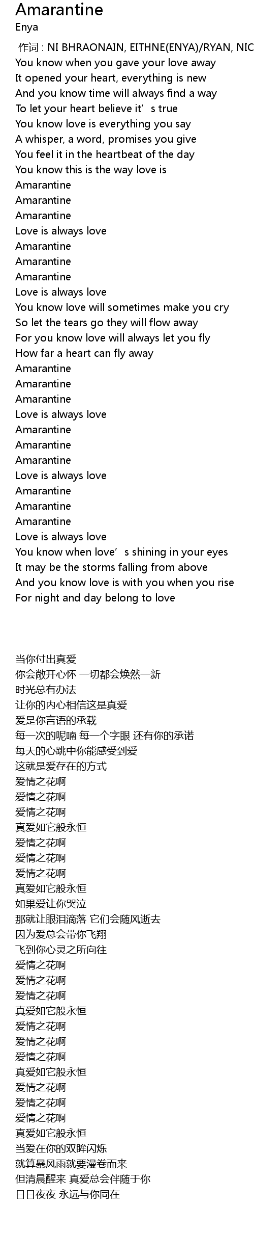 | [00:00.00] | 作词 : NI BHRAONAIN, EITHNE(ENYA)/RYAN, NICKY/RYAN, ROMA |