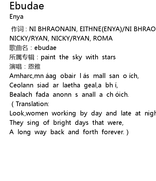 | [00:00.00] | 作词 : NI BHRAONAIN, EITHNE(ENYA)/NI BHRAONAIN, EITHNE(ENYA)/RYAN, NICKY/RYAN, NICKY/RYAN, ROMA |