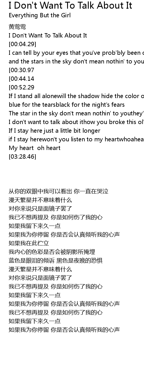 | [01:35.95][00:30.97] | I don' t want to talk about ithow you broke my heart |