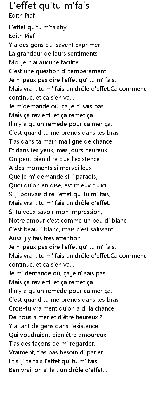 | Mais vrai : tu m' fais un dr le d' effet. a commence là, a passe par là, a continue, et a s' en va... | |