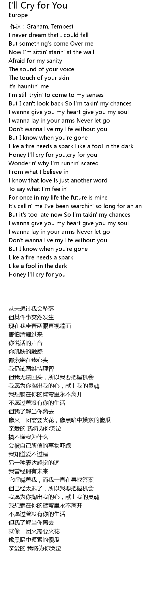 | [01:25.06] | Honey I'll cry for you,cry for you |