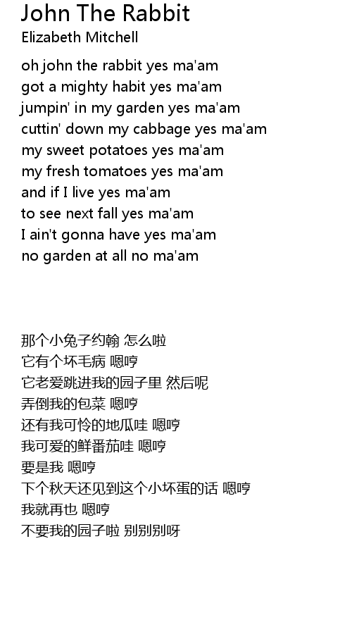 | [00:12.16] | oh john the rabbit yes ma'am |
