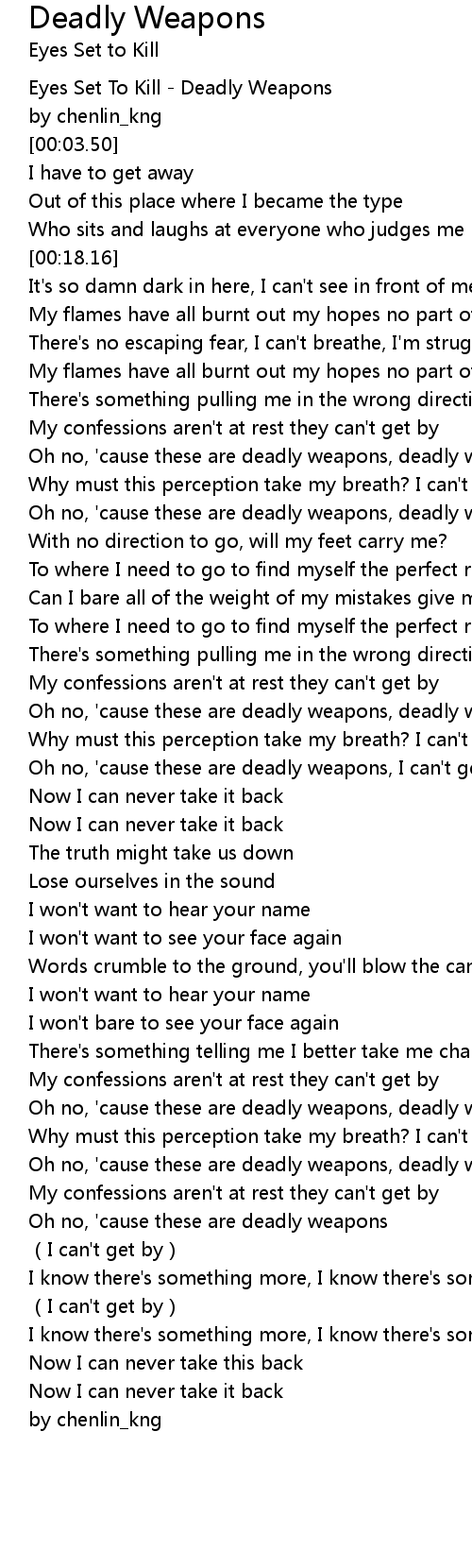 | [00:01.42] | Eyes Set To Kill Deadly Weapons |