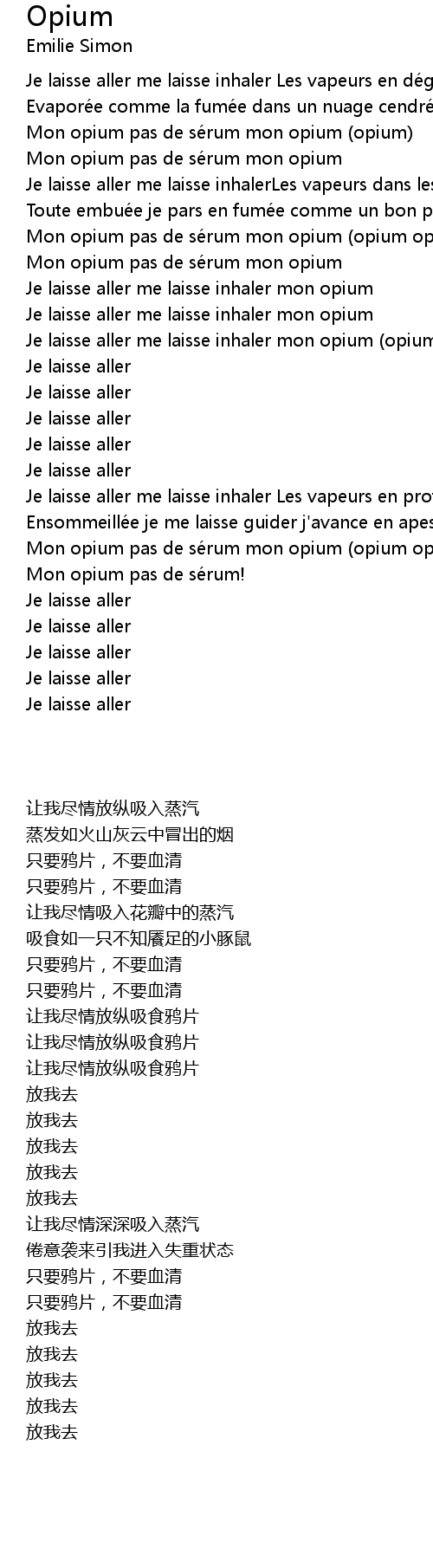 | [1:14.960] | Je laisse aller me laisse inhaler mon opium opium |