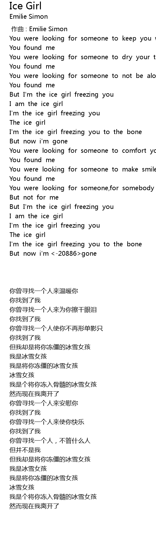 | [00:59.300] | I' m the ice girl freezing you to the bone |