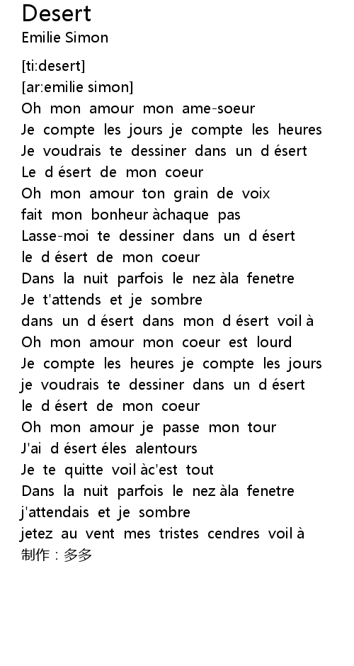 | [00:44.76] | le d e sert de mon coeur |