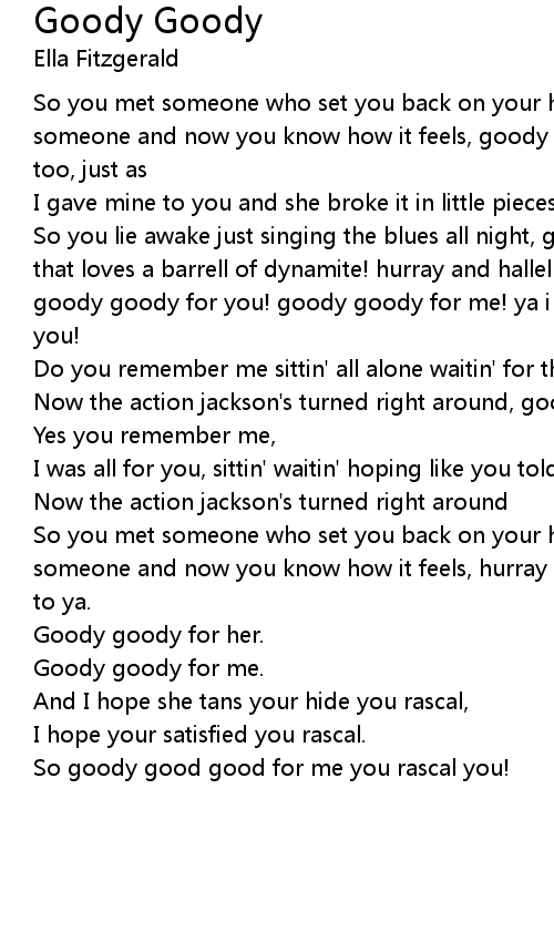 So you lie awake just singing the blues all night, goody goody! and you found that loves a barrell of dynamite! hurray and halleluyah, you had it comin to ya goody goody for you! goody goody for me! ya i hope you're satisfied you rascal you! |