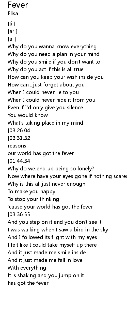 | [03:58.13][03:36.55][03:15.37][02:32.67] | Your world has got the fever |