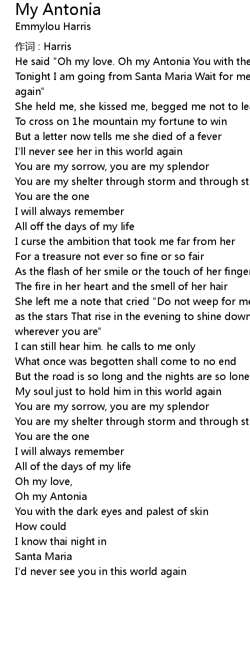 | He said "Oh my love. Oh my Antonia You with the dark eyes and palest of skin Tonight I am going from Santa Maria Wait for me till I'm in your arms once again" | |