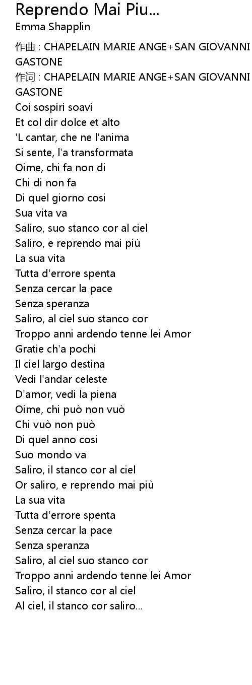 | 作词 : CHAPELAIN MARIE ANGE+SAN GIOVANNI ANDREA+DI COSTANZO VINCENT+DI MURTA GASTONE | |