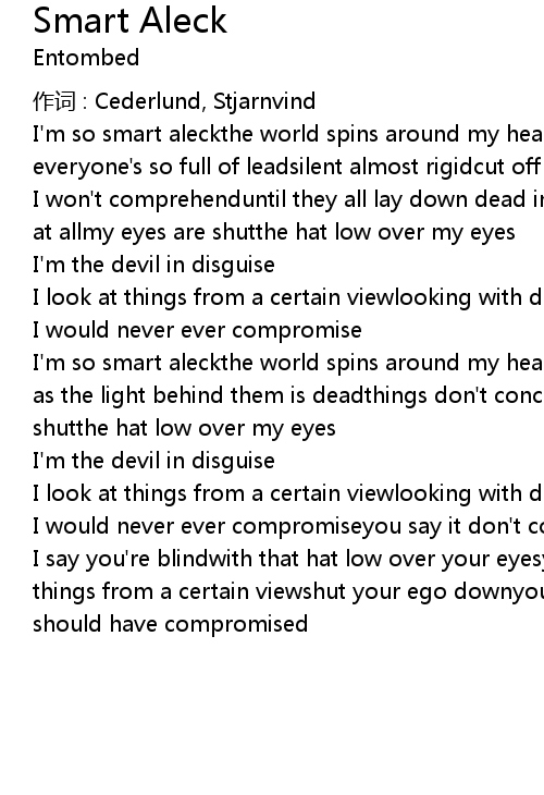 | I' m so smart aleckthe world spins around my headmy eyes are vague and emptyjust as the light behind them is deadthings don' t concern me at allmy eyes are shutthe hat low over my eyes | |