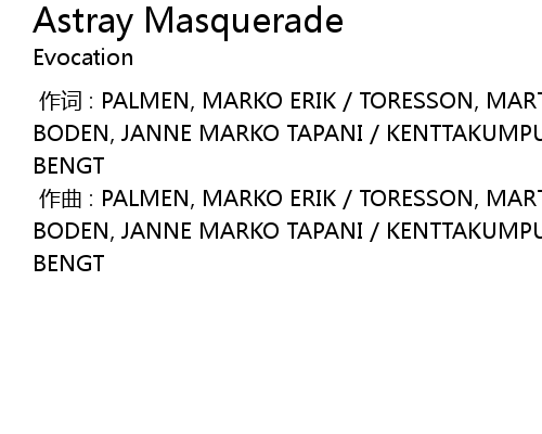 | [00:00.000] | zuò cí : PALMEN, MARKO ERIK TORESSON, MARTIN PELLE KENTTAEKUMPU BODEN, JANNE MARKO TAPANI KENTTAKUMPU, VESA VEIKKO JUHANI JOSEFSSON, THOMAS BENGT |