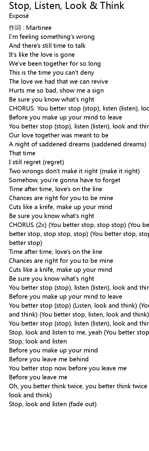| You better stop stop Listen, look and think You better stop, listen, look and think You better stop, listen, look and think | |