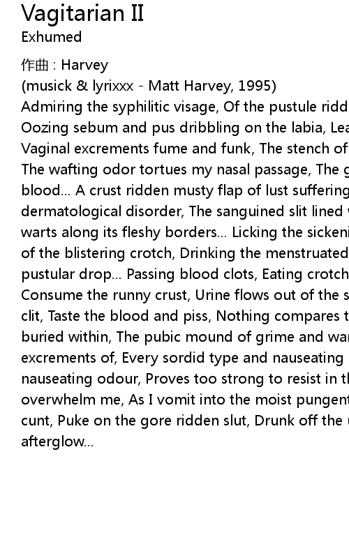 | cunt, Puke on the gore ridden slut, Drunk off the urine flow, I bathe in the | |