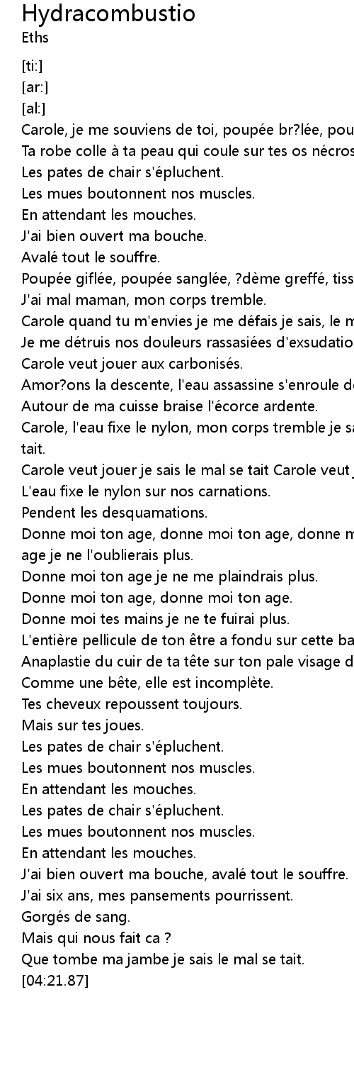 | [01:30.66] | Poupée giflée, poupée sanglée, ?dème greffé, tissus cendrés. |
