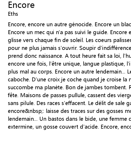 | Encore, encore un autre ge nocide. Encore un blackos shoote dans le bide. Encore un mec qui n' a pas suivi le guide. Encore et encore. Un autre lendemain glisse vers chaque fin de soleil. Les coeurs palissent, un oeil se plisse comme pour ne plus jamais s' ouvrir. Soupir d' indiffe rence, cette fille, par chance, prend donc naissance. A tout heure fait sa loi, l' humain se noie, se croit, encore une fois, l' tre unique, langue plastique, l' immortel qui n' aura jamais plus mal au corps. Encore un autre lendemain... Les images frappent, claquent ma caboche. D' une croix je coche quand je croise la mort et sa foche. Sur la toile succombe ma plane te. Bon de jambes tombent. Re sonnent les trompettes, mort se f te. Maisons de passes pullule, cassent des vierges prises pour des garces sans pilule. Des races s' effacent. Le de lit de sale ganache marche encore nbsp: laisse des traces sur des gosses morts. Encore un autre lendemain... Un bastos dans le bide, une femme qu' on assassine, un peuple qu' on extermine, un gosse couvert d' acide. Encore, encore, non! Encore! |