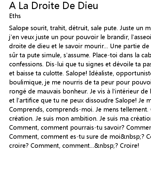 | Salope sourit, trahit, de truit, sale pute. Juste un morceau de ton cul, salope, j' en veux juste un pour pouvoir le brandir, l' asseoir, le voir pourrir a la droite de dieu et le savoir mourir... Une partie de ta luxure. Copule, c' est s r ta pute simule, s' assume. Placetoi dans la cabine, la boite a confessions. Dislui que tu signes et de voile ta passion. Montrelui tes ruines et baisse ta culotte. Salope! Ide aliste, opportuniste, anorexique et boulimique, je me nourris de ta peur pour pouvoir la vomir. Mon c ur se vide ronge de mauvais bonheur. Je vis a l' inte rieur de la vermine sous la poudre et l' artifice que tu ne peux dissoudre Salope! Je mens, je mens tellement. Comprends, comprendsmoi. Je mens tellement. Comprendsmoi. Je suis ma cre ation. Je suis mon ambition. Je suis ma cre ation. Juste ta fiction! Comment, comment pourraistu savoir? Comment, comment pourraistu m' avoir? Comment, comment estu sure de moi nbsp? Comment, comment pourraistu me croire? Comment, comment... nbsp? Croire! |