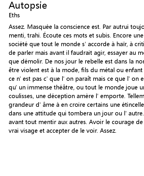 | Assez. Masquée la conscience est. Par autrui toujours trompé. Toi qui m' as menti, trahi. Écoute ces mots et subis. Encore une nouvelle autopsie de notre société que tout le monde s' accorde à haïr, à critiquer. Il est bien beau de parler mais avant il faudrait agir, essayer au moins de construire plutôt que démolir. De nos jour le rebelle est dans la norme, avoir l' air d' un fou, être violent est à la mode, fils du métal ou enfant des cités, ce qui compte ce n' est pas c' que l' on paraît mais ce que l' on est. Assez. La vie n' est qu' un immense théâtre, ou tout le monde joue un rôle, et bien souvent en coulisses, une déception amère l' emporte. Tellement de parure pour si peu de grandeur d' âme à en croire certains une étincelle est une flamme. Se cacher dans une attitude qui tombera un jour ou l' autre. Se mentir à soi même c' est avant tout mentir aux autres. Avoir le courage de regarder dans le miroir son vrai visage et accepter de le voir. Assez. |