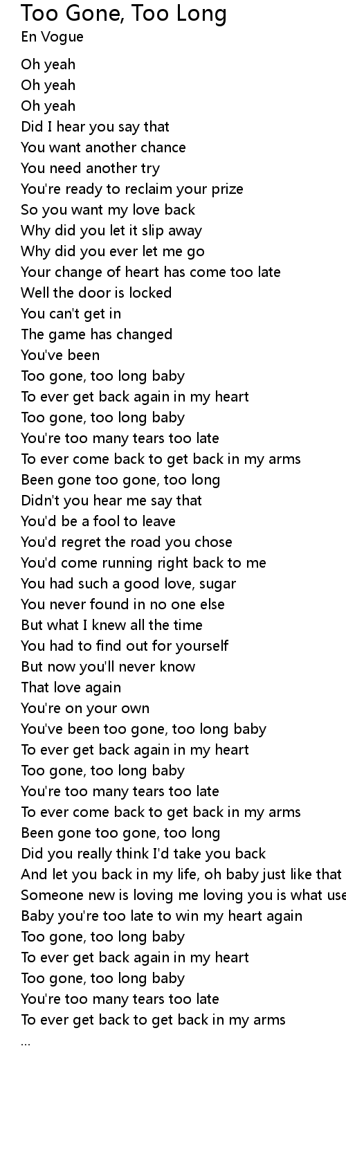 Been gone too gone, too long |